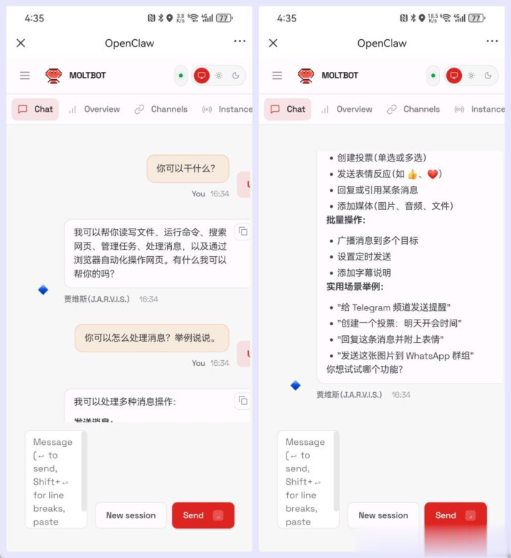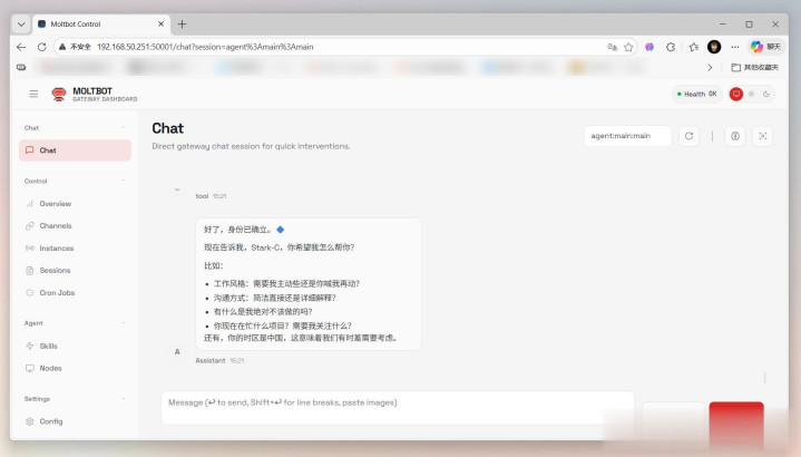 随便输入任何话语,它就会有对应的答复。至此,OpenClaw可以正式使用了!