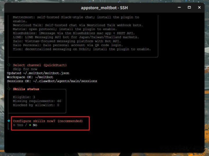 之后会提示是否安装skills(技能),相当于添加一些专用插件来赋予OpenClaw更多的能力。这个我们后期可以在页面配置,所以这里暂时选择“No”就可以了。