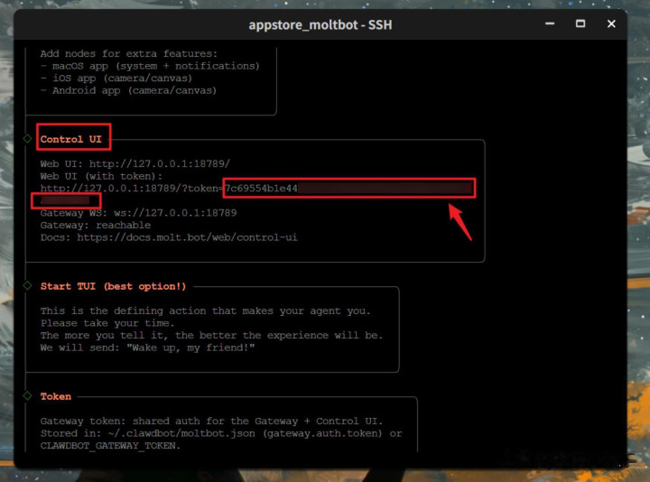 之后会有一个Control UI的方框,下面有一个token值,将它选中之后复制并粘贴保存下来待用。