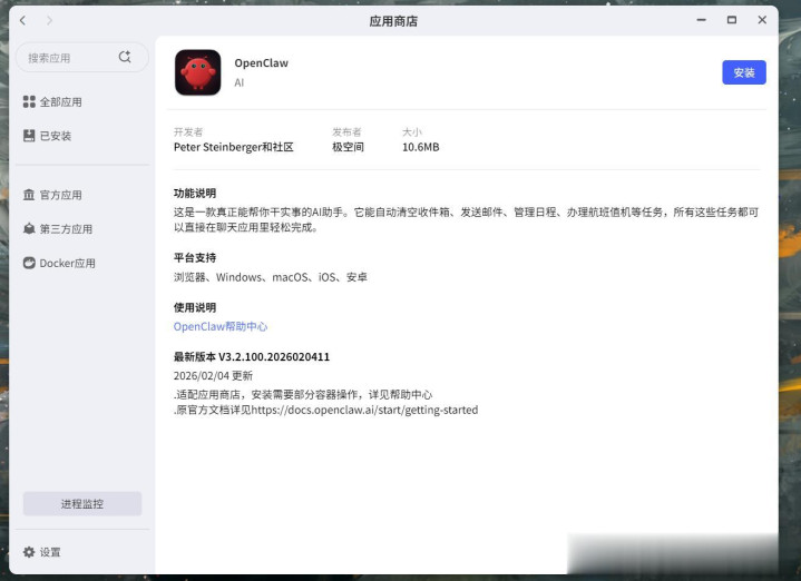 2,极空间应用商店的OpenClaw套件基于Docker,理论上所有支持Docker的机型都会支持(不清楚ARM的怎么样,我个人目前还没测试~)。