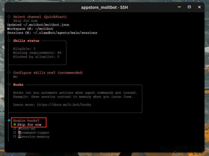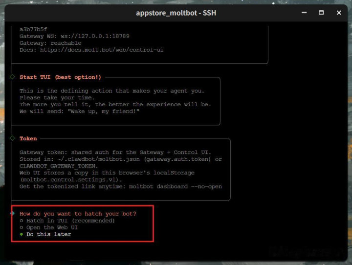 最后一个选项是How do you want to hatch your bot? ,选择最后一个“Do this later”,就完成OpenClaw的初始化配置了。