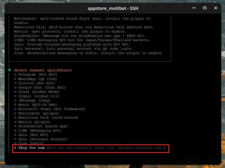 接着就来到OpenClaw交互软件的选择界面,目前它这里集成的都是国外的,我们都用不上,直接选择最后一个“Skip for now”暂时跳过。