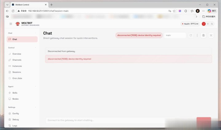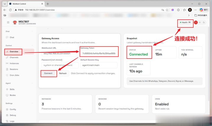 我们仅需点击左侧状态栏的“Overview”,将我们前面保存的token值粘贴到“Gateway Token”方框中,点击“Connect”,就能看到连接成功的标识。