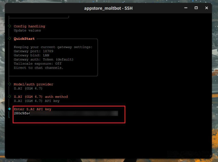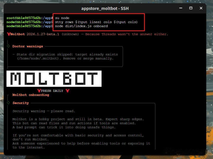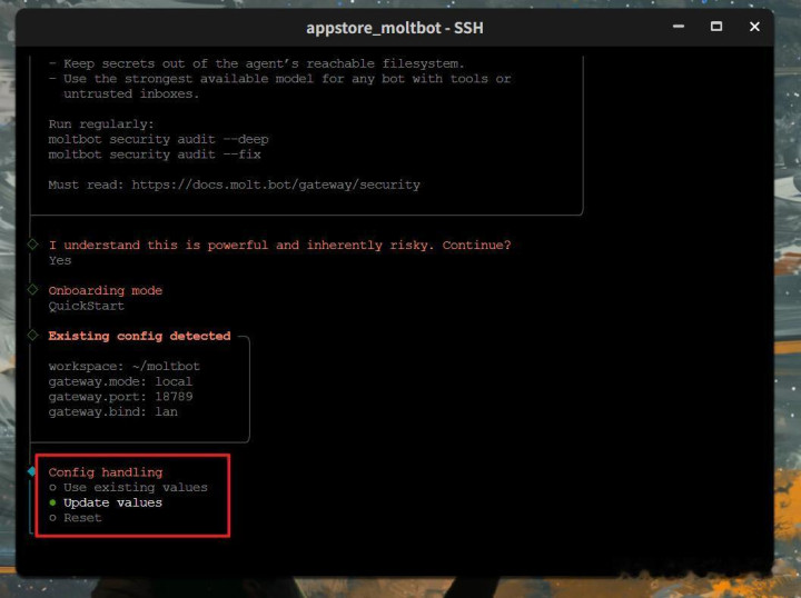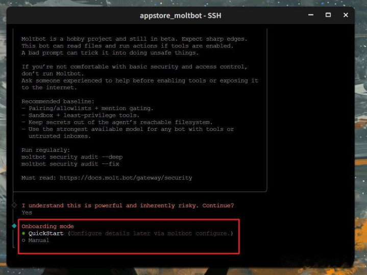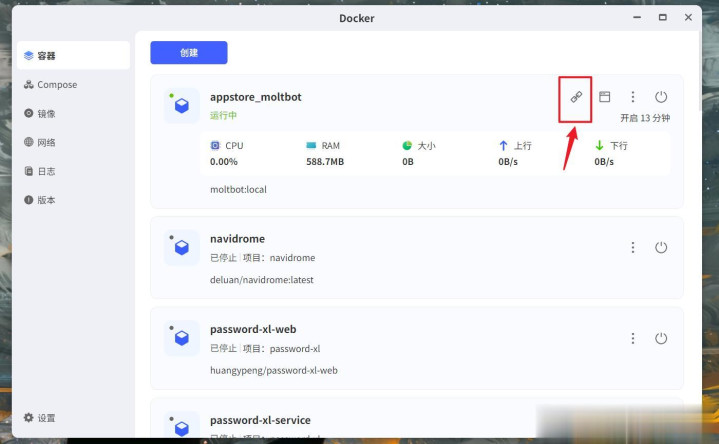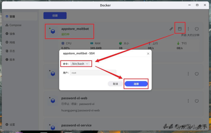 安装好的OpenClaw需要在Docker中进行初始化配置。直接打开运行中的OpenClaw项目(目前名字为“appstore_moltbot”,不排除后期正式推送会有变化)的SSH终端,命令选择“/bin/bash”,然后“连接”。