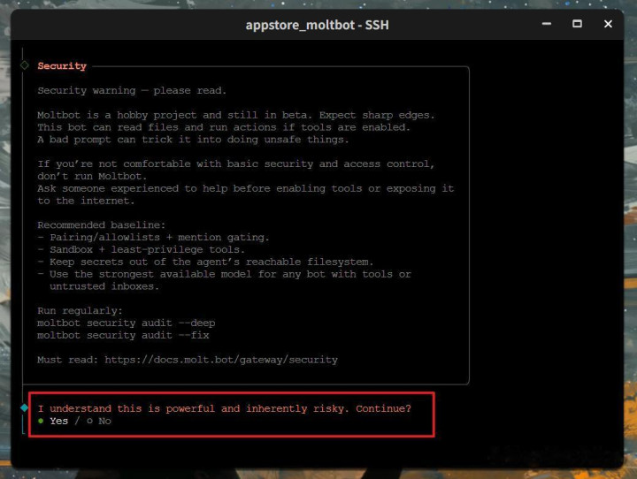 之后是一个安全提醒,大概是说它要的权限很高,我们也没得选,使用键盘左方向键选择“Yes”之后回车即可。
