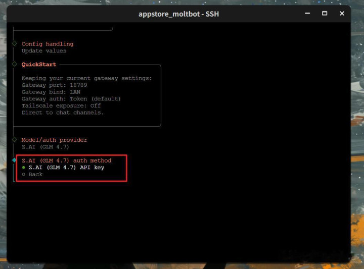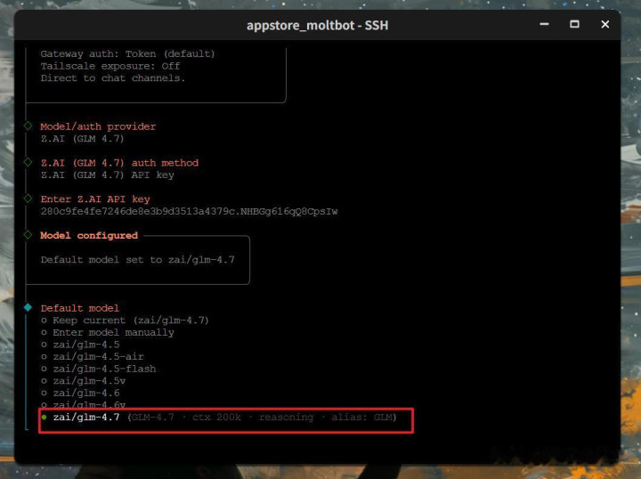 然后就是配置大模型的选项了,我使用的是智谱的GLM 4.7大模型,这里直接选它并回车就是了。